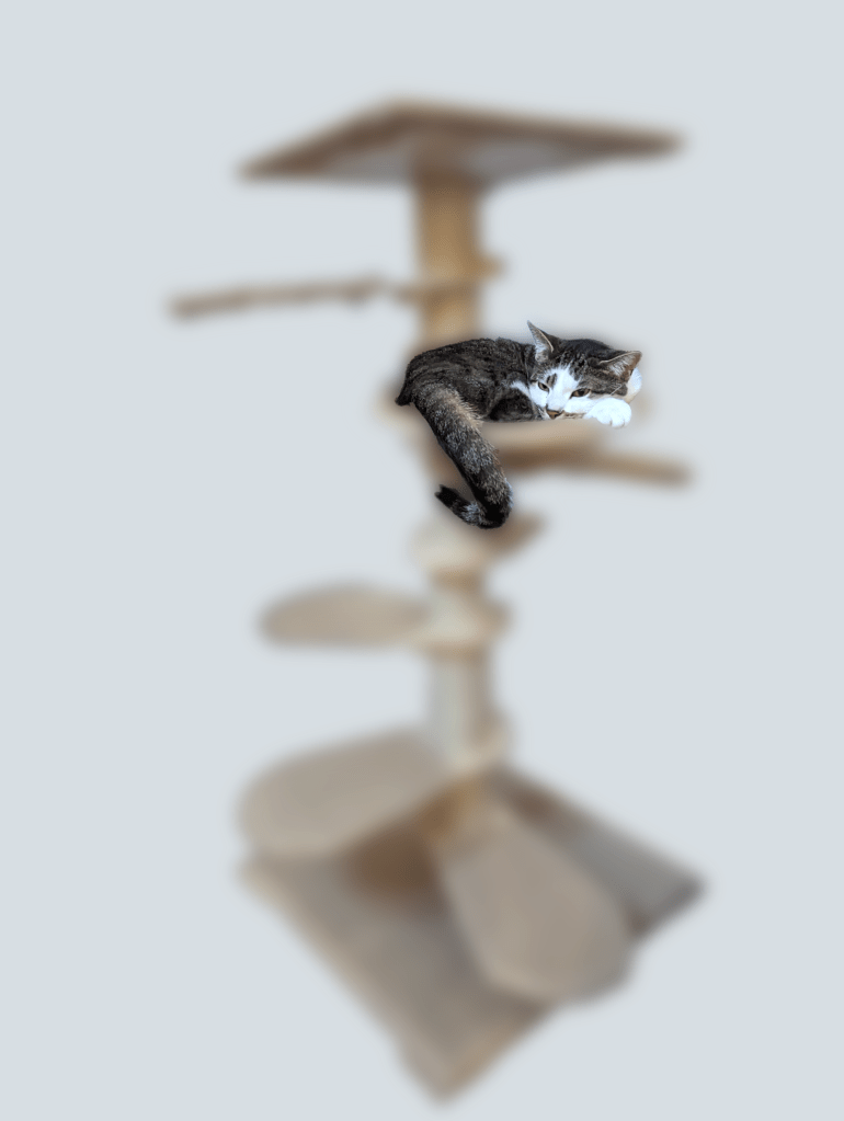 We are so excited to introduce our much-needed alternative to the common cat tree system, and we hope you enjoy the insight we will be providing into our ongoing process to develop a product that meets the needs of all of its users: from materials acquisition to manufacture, shipping to assembly, and long-term upkeep and end-of-life product management. For now, here’s a blurry teaser image with one of our product-testers: Cosmo!