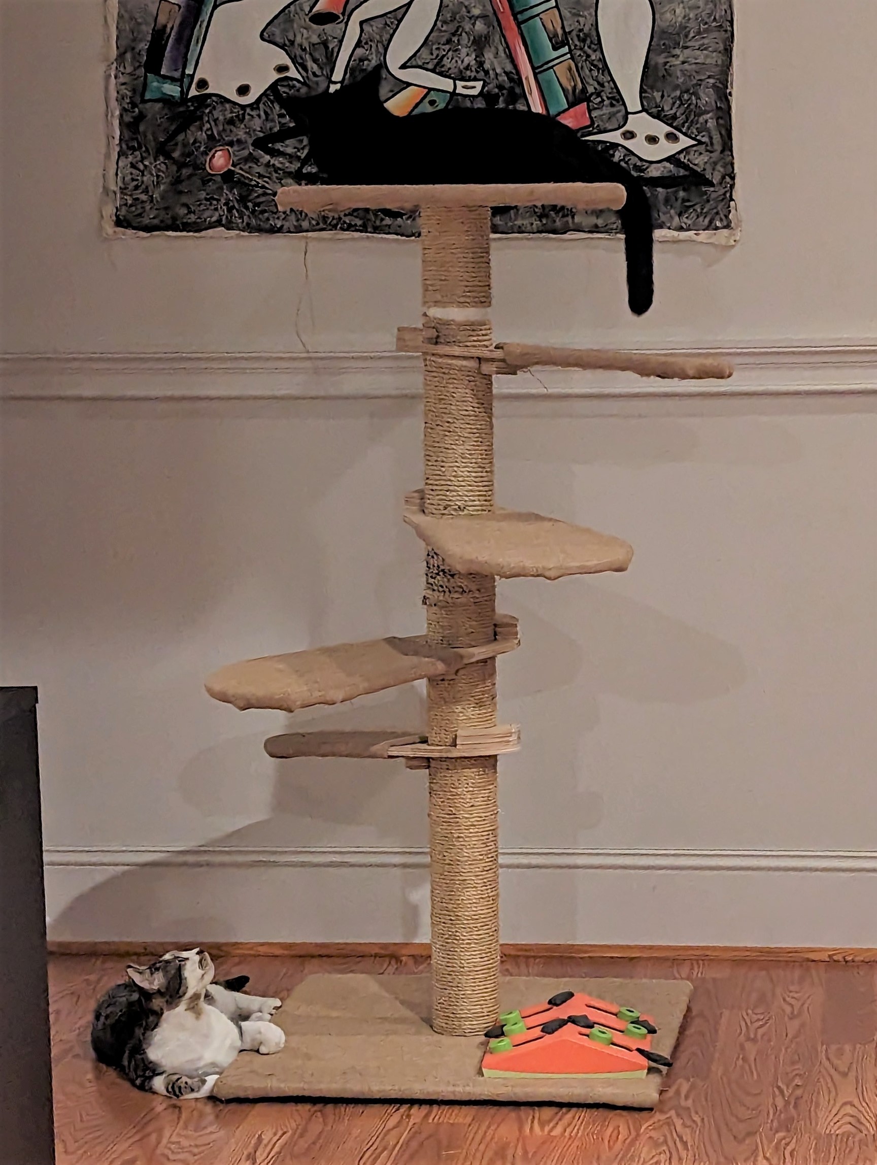 Leaf Tree Mk1 V1.0 was fairly wobbly with the wooden plugs at either end and hollow PVC as the center of the Trunk, Cosmo seemed to enjoy the way it would sway when lounging, but favored the mid-level Leafs for active maneuvers. He certainly seemed to appreciate the 4 foot assembly instead of the 8 foot extended arrangement from his first introduction.