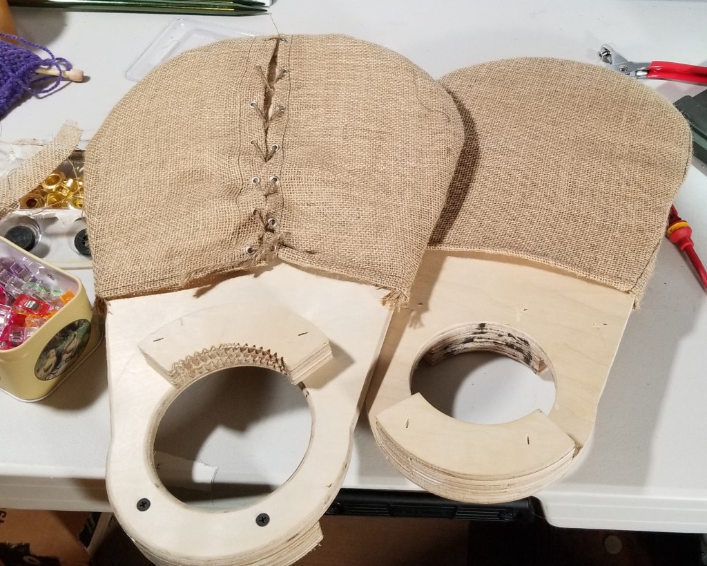 When the inventor made the new toothed gravity cleats, he took advantage of the new bare Leafs to make the first set of removable covers. The bottom of the cover is one layer of burlap attached to the top, which is two layers of Dream Quilter’s cotton batting under two layers of burlap. The bottom is split down the middle, lined with 1/8-inch grommets, and secured together with jute twine.