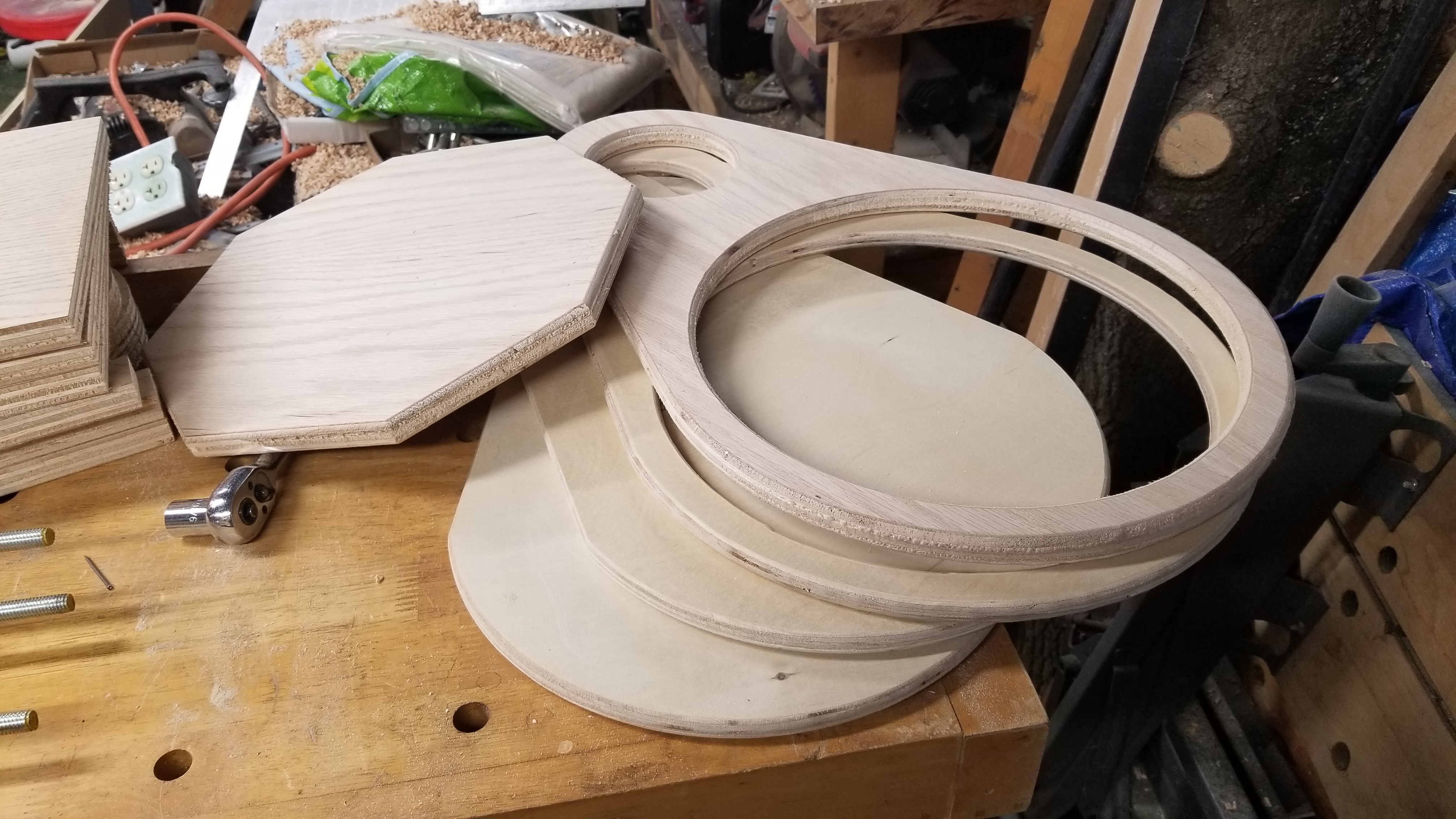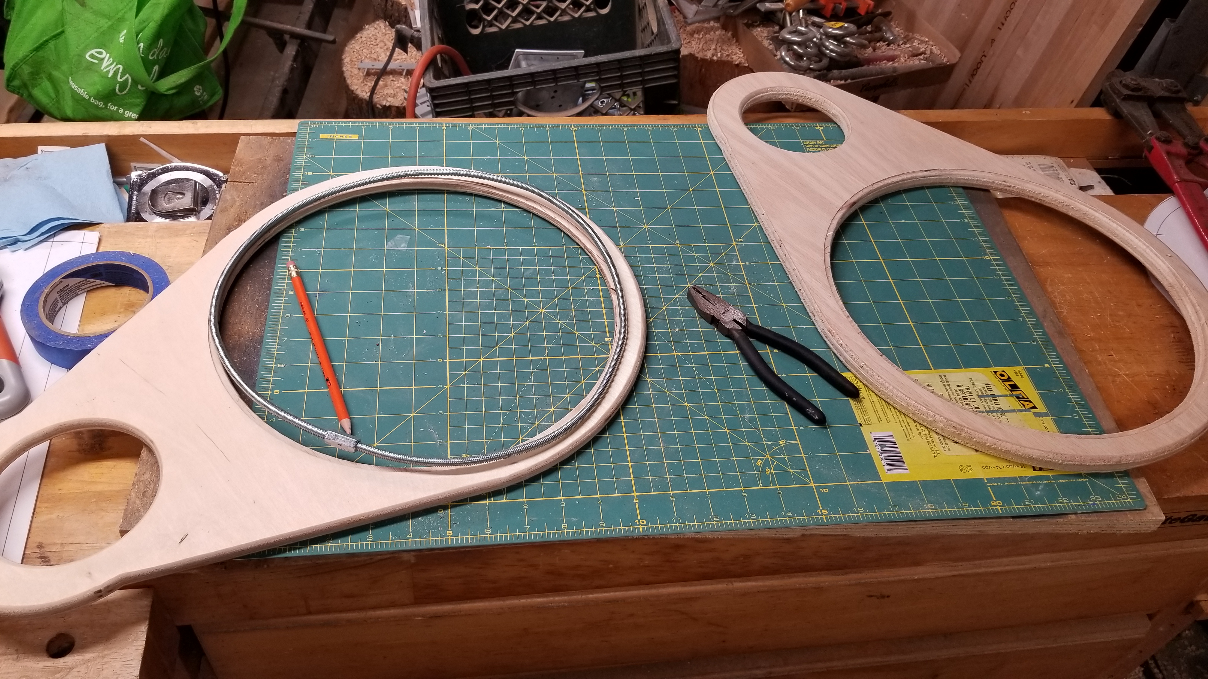 The inventor had been making removable covers for the Leafs, and took this opportunity to execute his design for hammock V2. The new hammock Leaf had a 14-inch outer diameter instead of the original 12-inch, a 2-inch plywood rim with a ~1/4-inch rabbeted interior lip along the top of the Leaf’s rim for the now separate hammock insert to set into. The hammock insert was made using a 39.25-inch length of 1/4-inch threaded rod (pencil rod would have been ideal, but it wasn’t in stock locally) that was bent by hand and connected at the ends using a threaded coupler to allow for the attachment/removal of the hammock cover. The cover was made using a base layer of burlap, two layers of Dream Cotton Batting, and two more layers of burlap on top. (We’re happy to share the pattern on request)