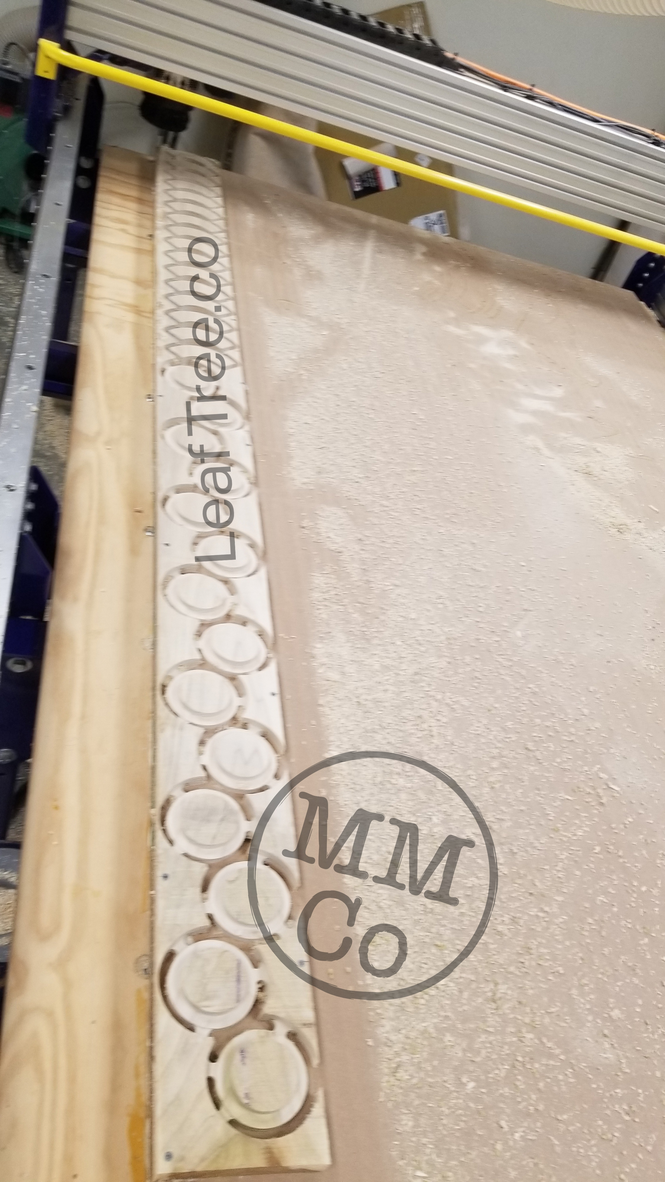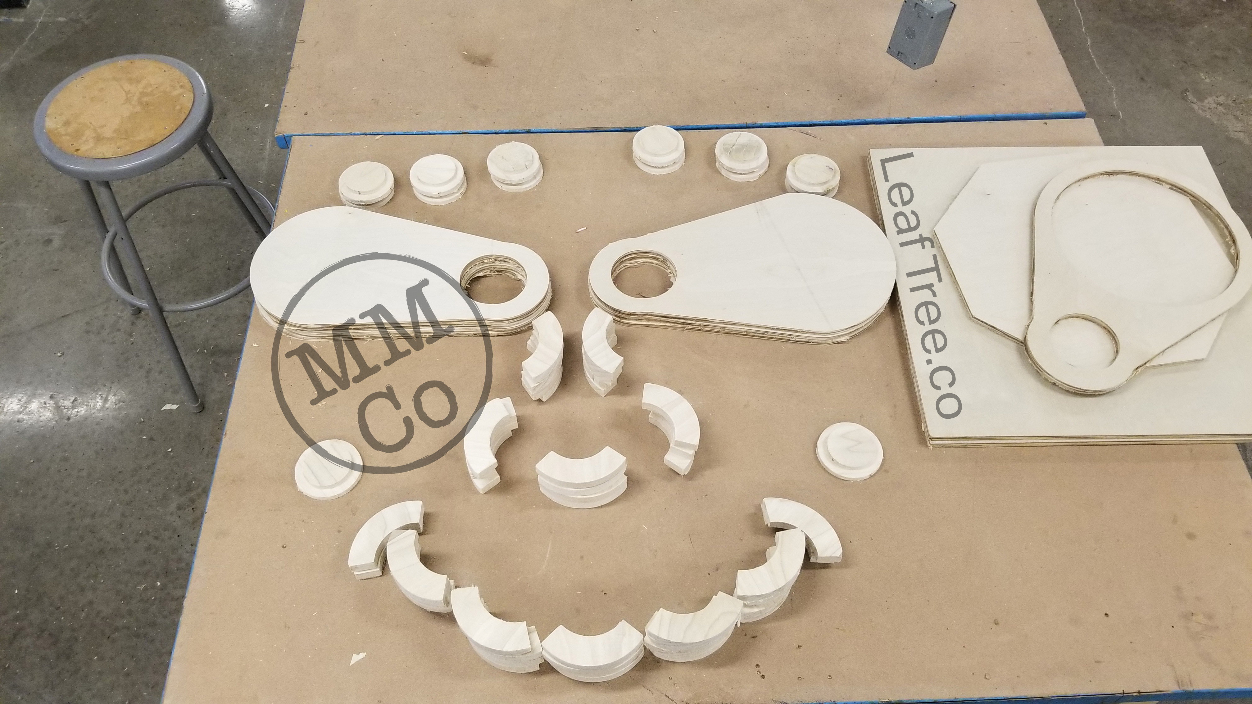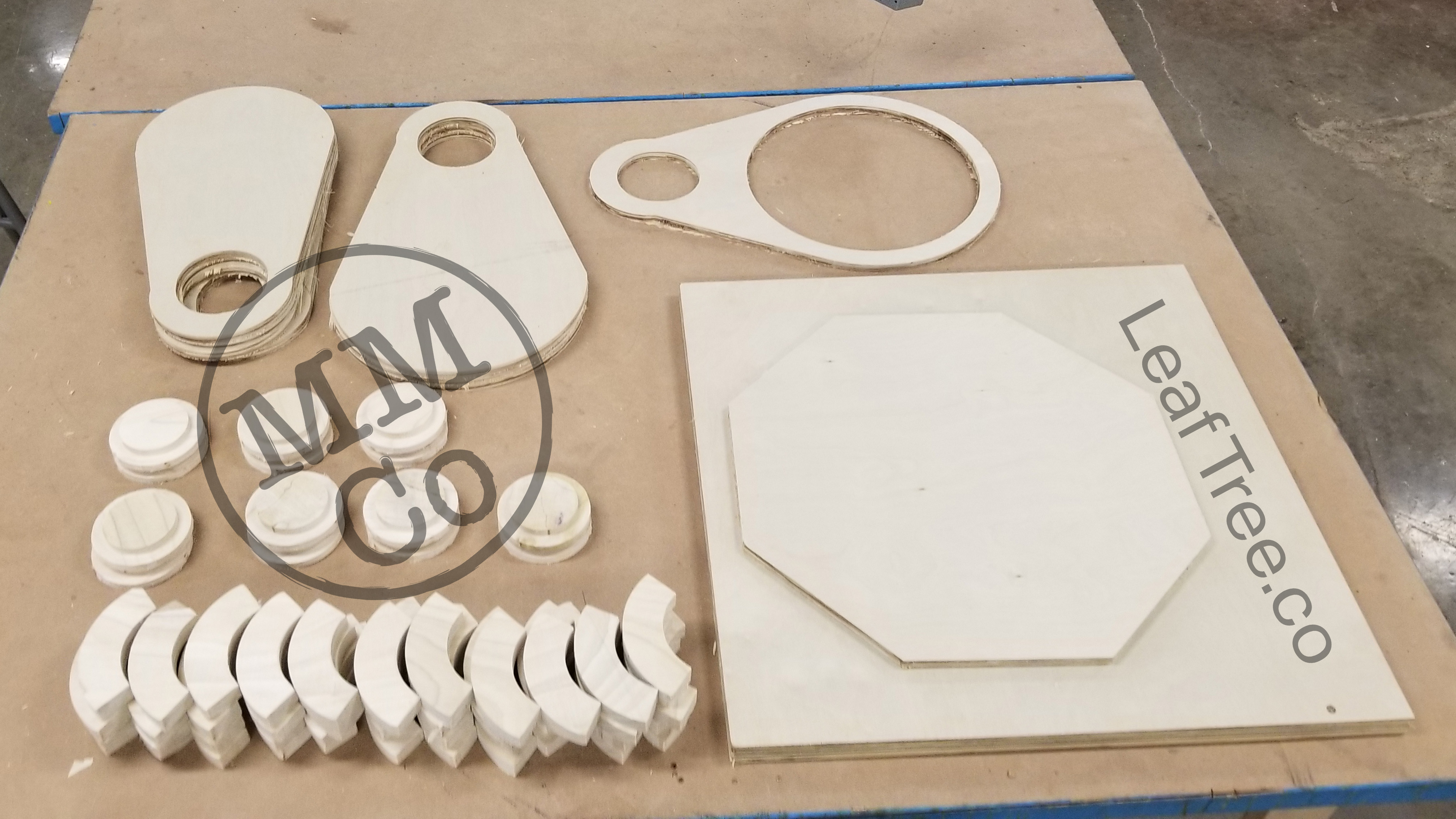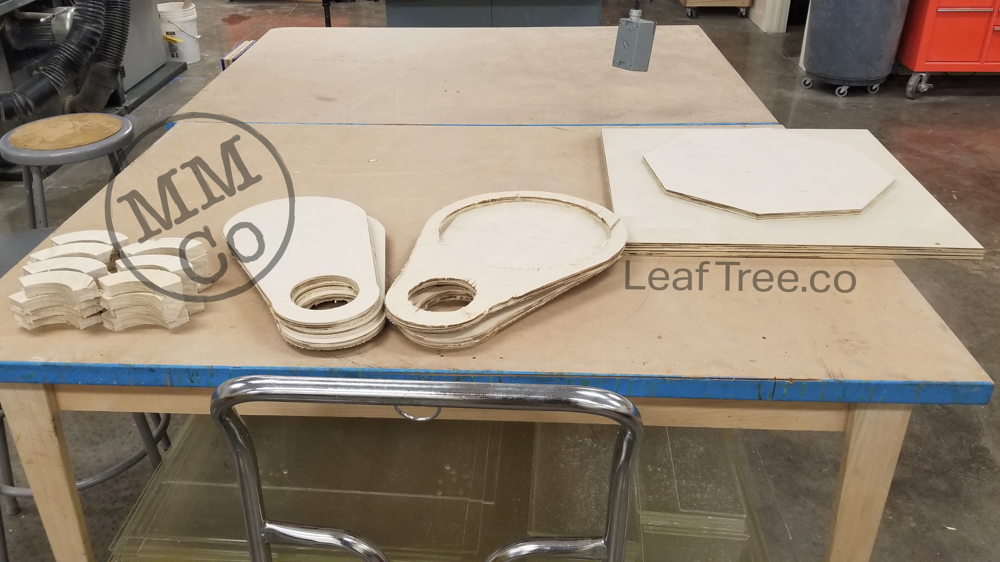 Caps for the Trunks and the heels and toes of the Leaf cleat assembly were cut from the same piece of poplar board (the softest hardwood, or the hardest softwood (depending on who you ask)), and the Leafs, Tree Top, and the Root System Mk 2 were cut from the same piece of Birch plywood.
