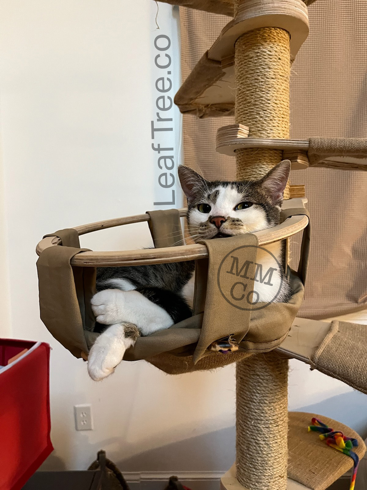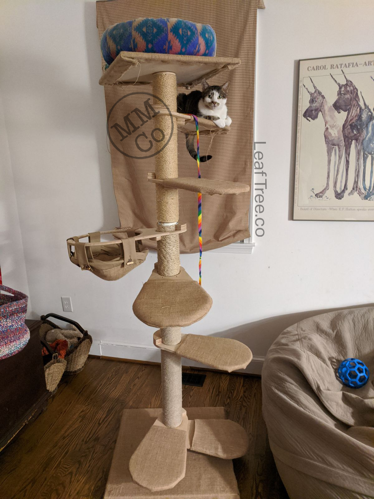 In early July everyone was back at Cosmo’s house getting ready for a big cross-country trip! Cosmo was kind enough to allow Boo to stay with him—and they got the Leaf Tree Mk1 V1.5 in a 6 foot assembly to lounge and play on while the humans were away!