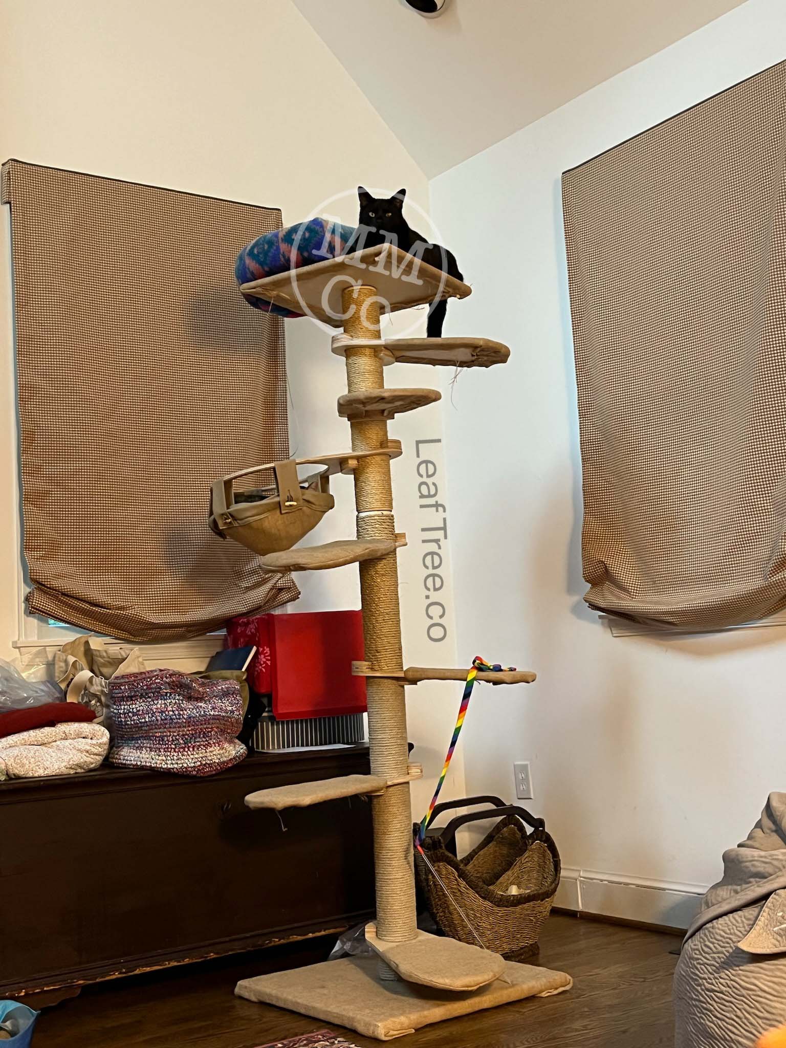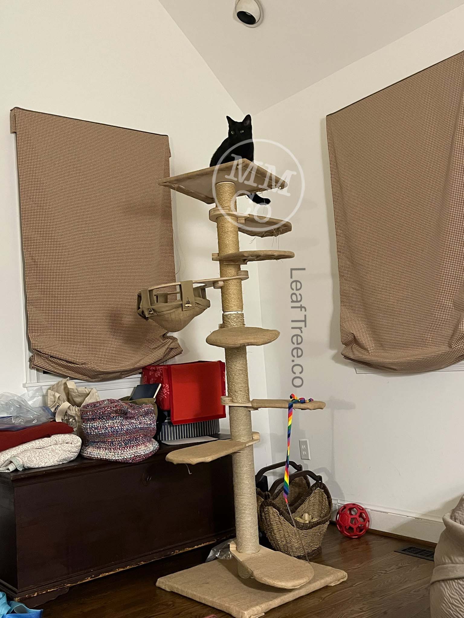 Once the humans left on their road trip in early July, Boo immediately designated the top of the Leaf Tree as his spot during dinner time. It gave him a great view of Cosmo’s humans during those busier hours in that space, and the ability to jump on any food opportunities that arose!