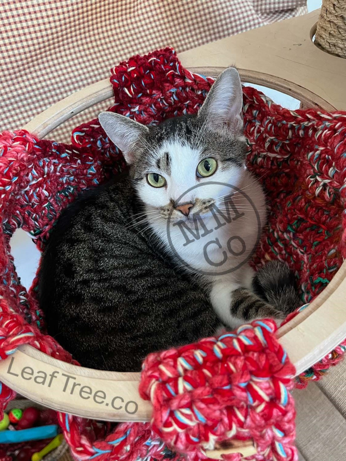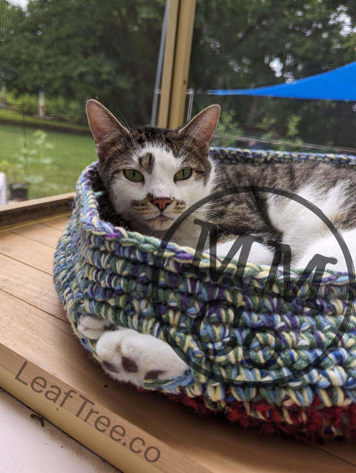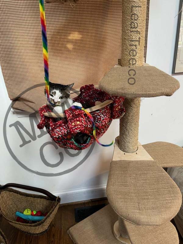 While on our roadtrip, Cosmo’s humans had the Leaf Tree Mk1V1.5, and we asked Cosmo’s mom, who is an avid crocheter who has been making the best cat beds from scrap yarn, if she would be able to create a custom hammock insert for the Hammock Leaf—and she certainly delivered! The inventor left a handful of the toggles that were used in the Hammock insert V3, and Cosmo’s mom was able to modify her cat bed design to mount to the Leaf!